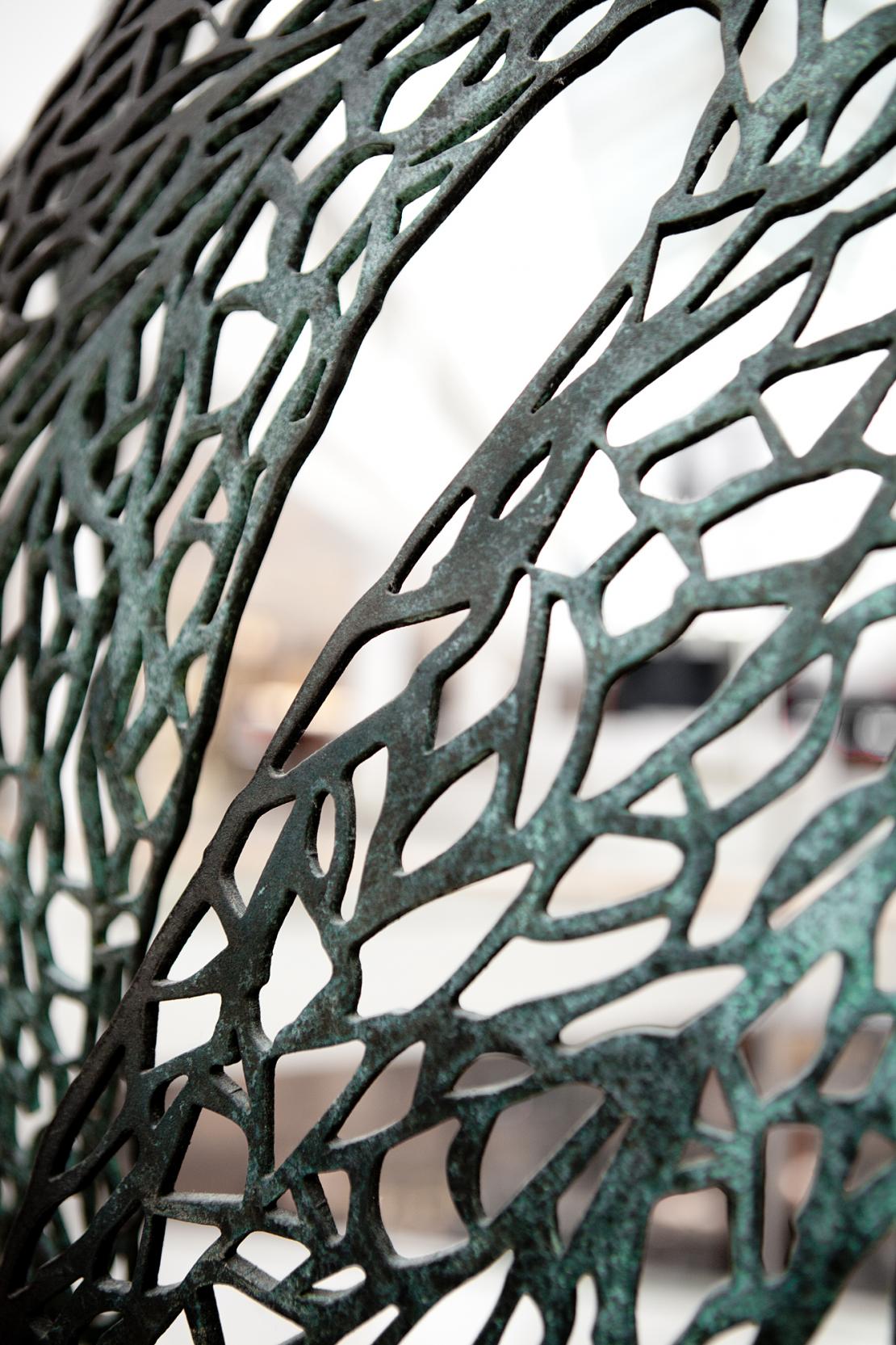 The Bound sculptures were commissioned for Westfield Miranda. My creative process began with a visit to the Royal Botanic Gardens in Sydney. I sat on the ground and made detailed sketches of the pattern of leaf veins. I painted over these sketches with a fine brush and ink so that the lines would be calligraphic. The leaves were laser cut in 5mm thick mild steel. I worked with a blacksmith, Lok Sutherland to bring the flat, heavy steel to life, curving it into beautiful, poetic forms.