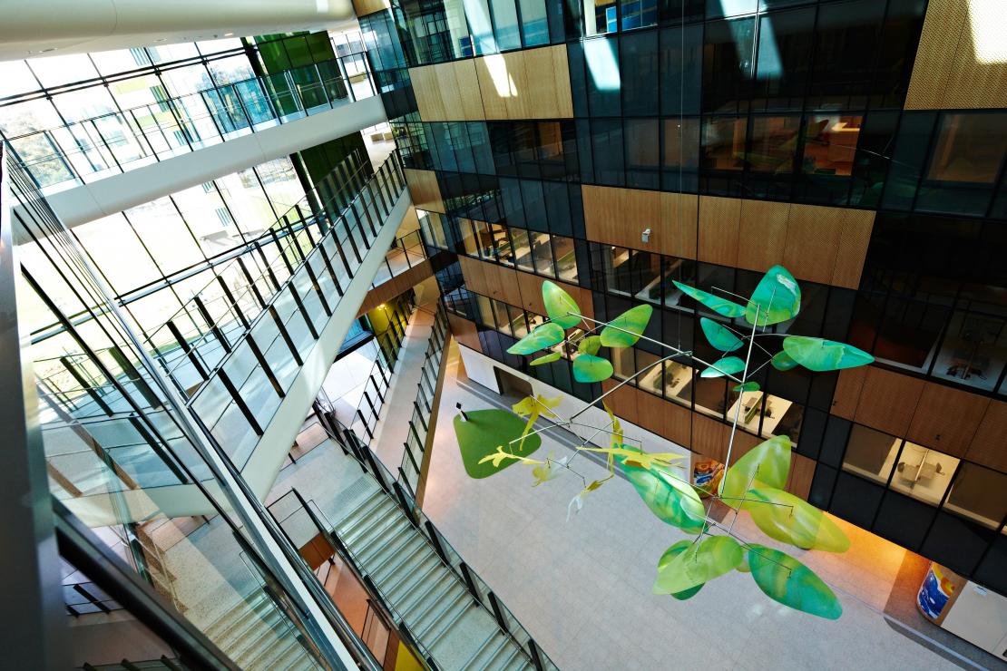The principal audience for the work is children. My inspiration for the winged creatures in the mobiles came from children playing in nature. I have used bright colours because children respond to colour, recognising anything brightly coloured as specially for them. The lithe figures of winged children float amongst large leaves in the atrium space, the overlapping leaf forms creating the effect of a garden in the sky.